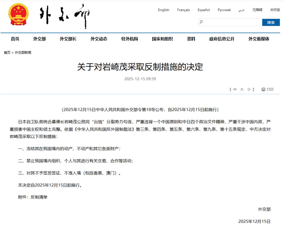原自卫队参谋长岩崎茂公然勾结“台独”分裂势力,严重违反一个中国原则和中日四个政治文件精神,严重干涉中国内政,严重损害中国主权和领土完整。根据《中华人民共和国反外国制裁法》第三条、第四条、第五条、第六条、第九条、第十五条的规定,中方决定对岩崎茂采取以下反制措施。