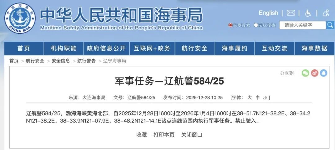 据中国海事局网站报道,大连海事局发布了航运警告。 2025年12月28日16时至2026年1月4日16时,将在渤海海峡和黄海北部部分地区执行军事任务。不允许进入。